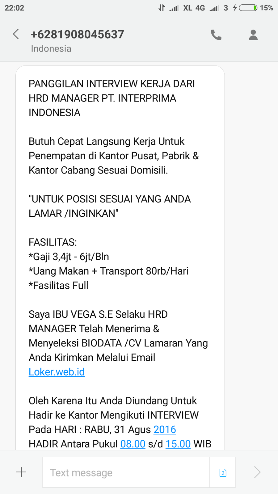 Sesuatu banget kalo para jobseeker terima sms kaya gini kan. Etss jangan seneng dulu gan, itu penipuan..
